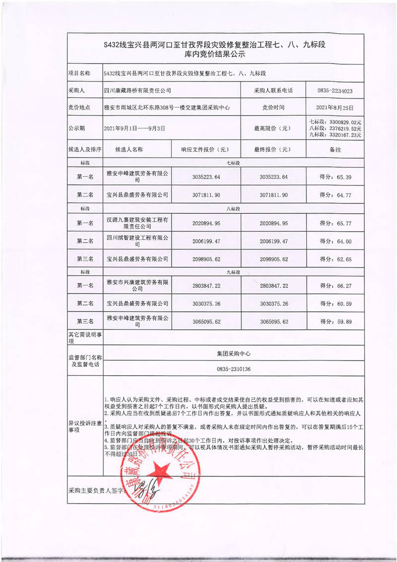 四川康藏路橋有限責任公司S432線寶興縣兩河口至甘孜界段災(zāi)毀修復整治工程七、八、九標段庫內(nèi)競價結(jié)果公示
