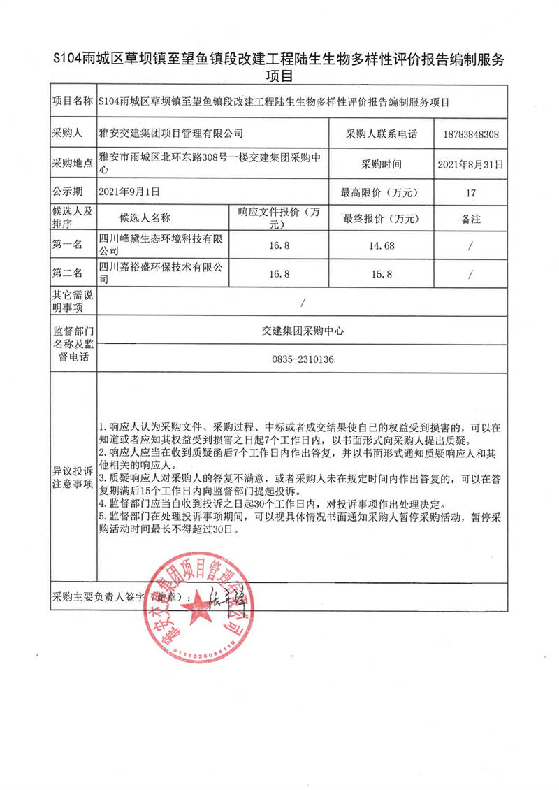 雅安交建集團(tuán)項(xiàng)目管理有限公司S104雨城區(qū)草壩鎮(zhèn)至望魚(yú)鎮(zhèn)段改建工程陸生生物多樣性評(píng)價(jià)報(bào)告編制服務(wù)項(xiàng)目評(píng)審結(jié)果公示