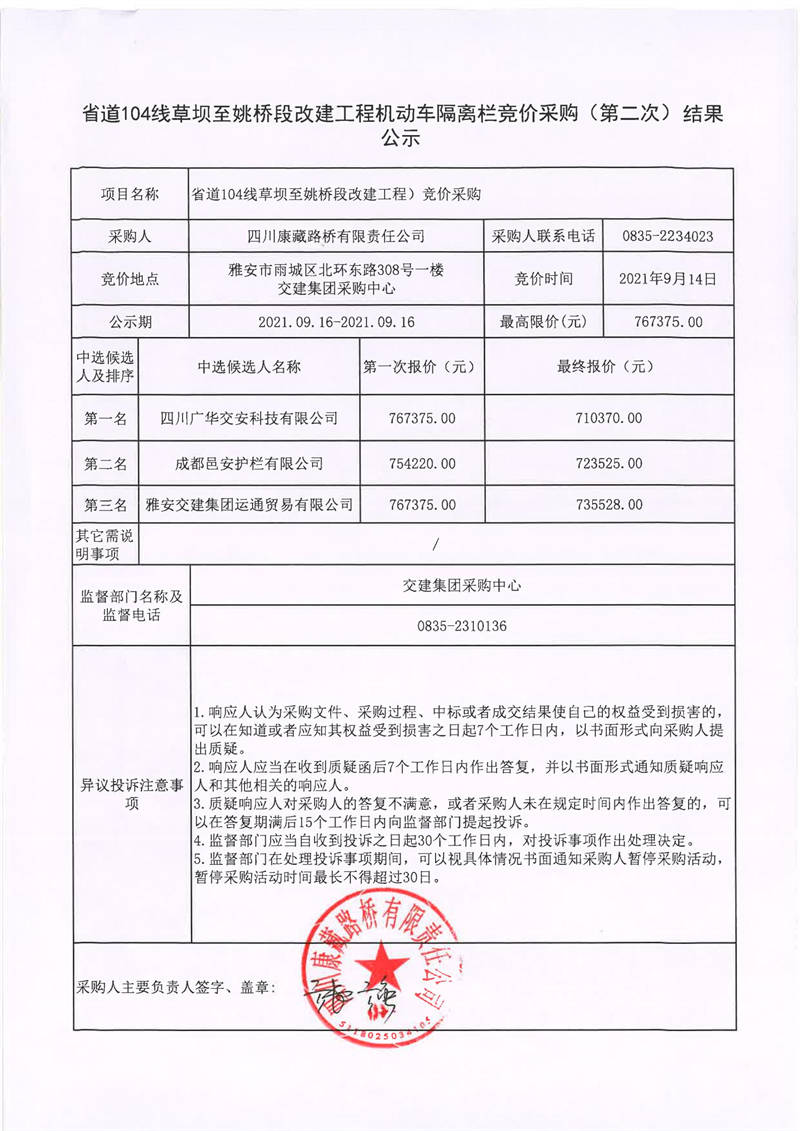 四川康藏路橋有限責任公司省道104線草壩至姚橋段改建工程機動車隔離欄競價采購(第二次)結果公示
