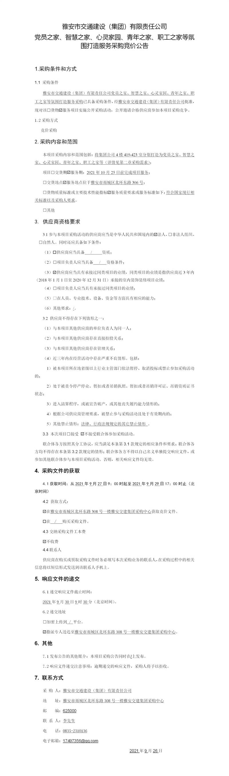 雅安市交通建設(shè)(集團(tuán))有限責(zé)任公司黨員之家、智慧之家、心靈家園、青年之家、職工之家等氛圍打造服務(wù)采購競(jìng)價(jià)公告