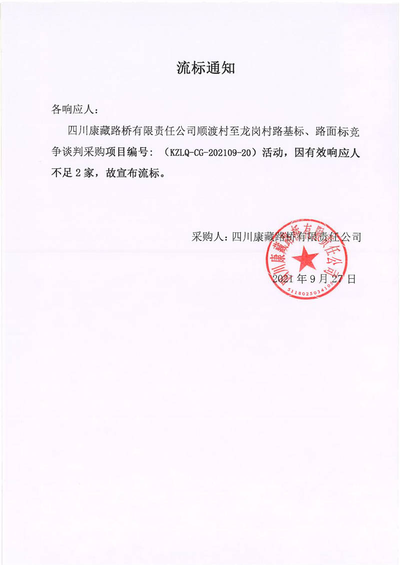 四川康藏路橋有限責(zé)任公司順渡村至龍崗村路基標(biāo)、路面標(biāo)競(jìng)爭(zhēng)談判采購項(xiàng)目流標(biāo)通知