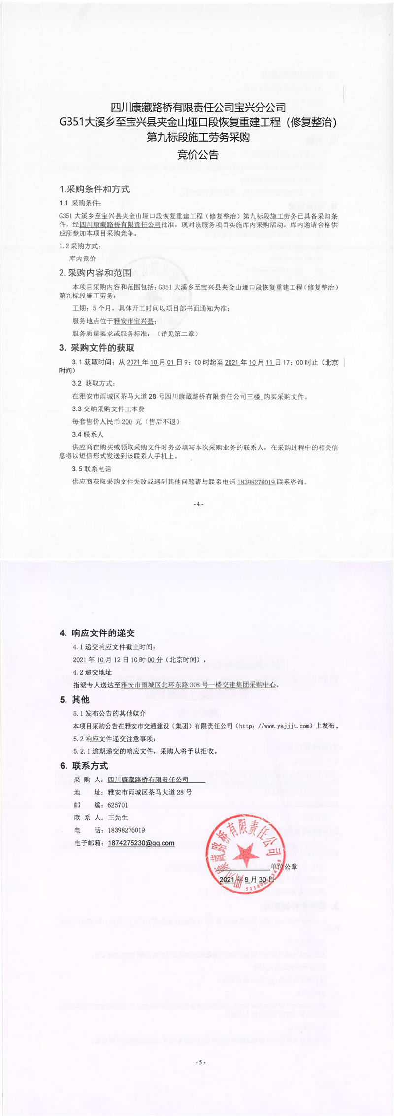 四川康藏路橋有限責任公司寶興分公司G351大溪鄉(xiāng)至寶興縣夾金山埡口段恢復(fù)重建工程(修復(fù)整治)第九標段施工勞務(wù)采購競價公告