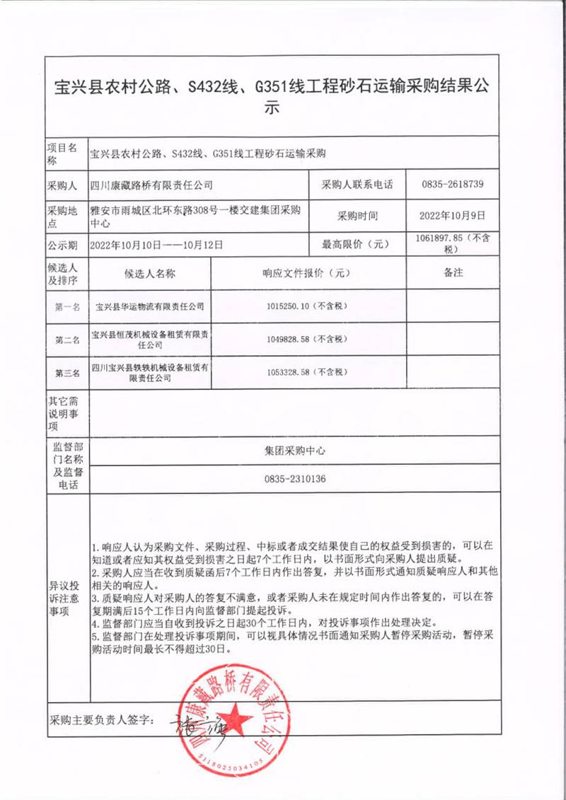 四川康藏路橋有限責(zé)任公司寶興縣農(nóng)村公路、S432線、G351線工程砂石運(yùn)輸采購結(jié)果公示