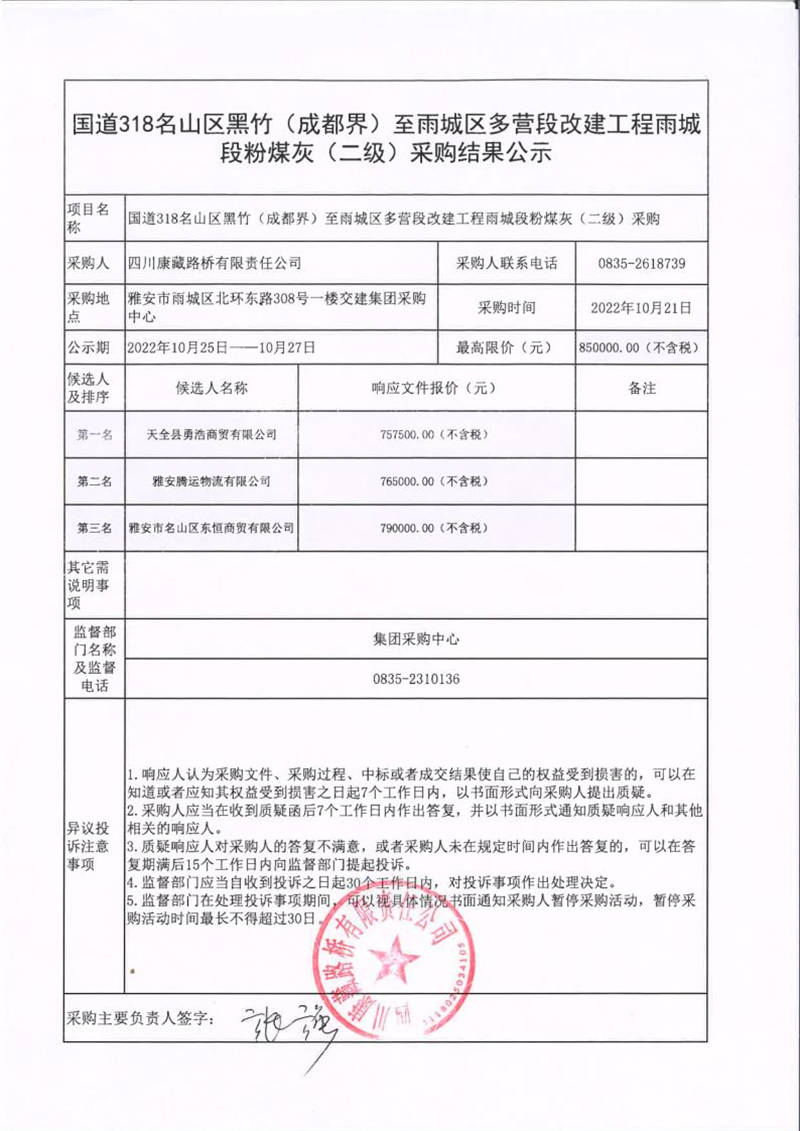 四川康藏路橋有限責(zé)任公司國(guó)道318名山區(qū)黑竹(成都界)至雨城區(qū)多營(yíng)段改建工程雨城段粉煤灰(二級(jí))采購結(jié)果公示