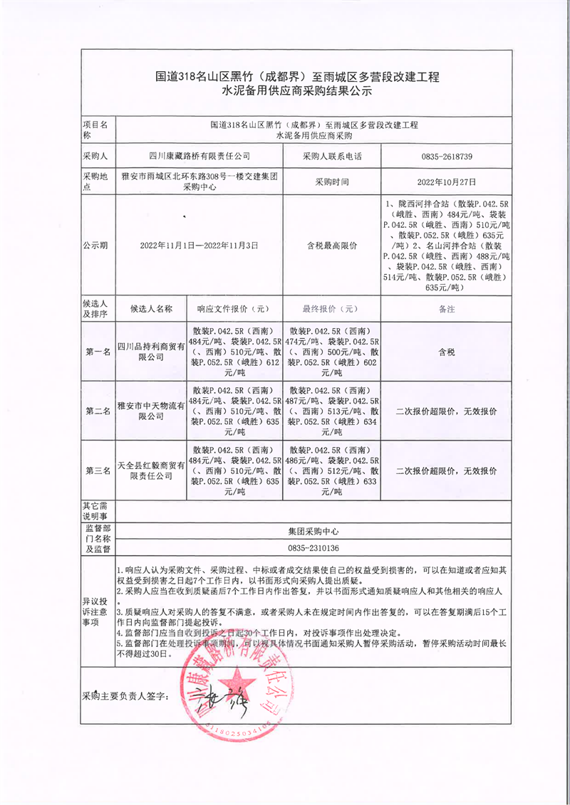 四川康藏路橋有限責任公司國道318名山區(qū)黑竹(成都界)至雨城區(qū)多營段改建工程水泥備用供應商采購結(jié)果公示