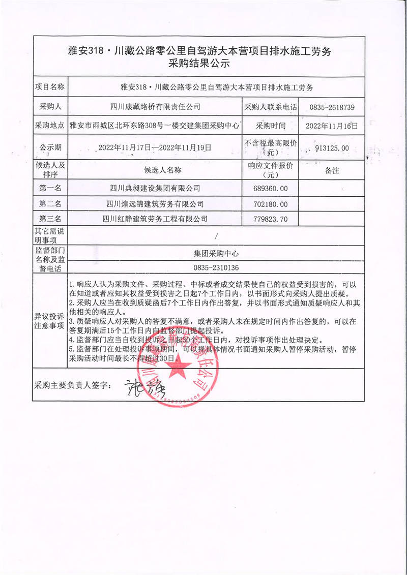 四川康藏路橋有限責任公司雅安318·川藏公路零公里自駕游大本營項目排水施工勞務采購結果公示