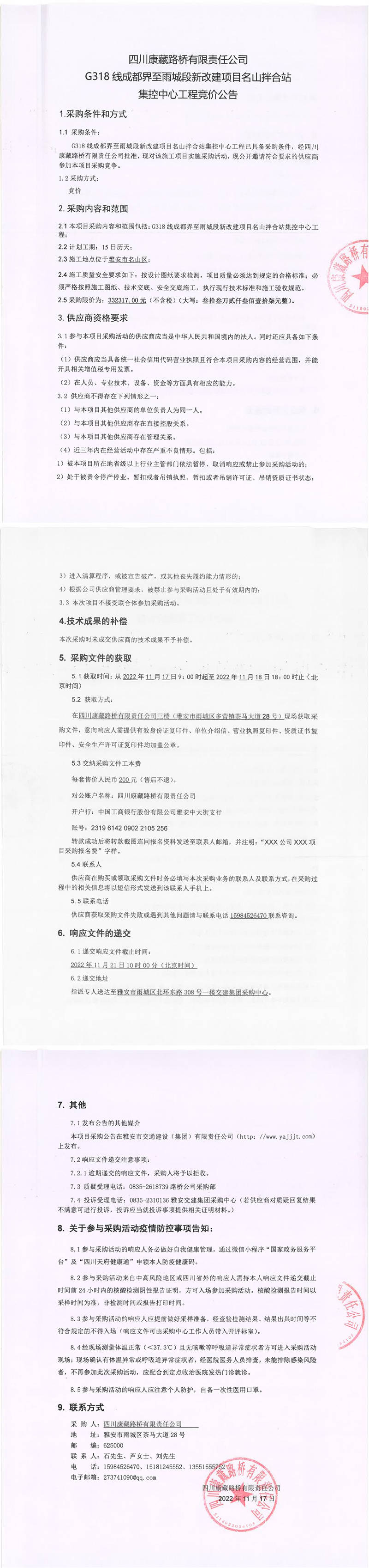 四川康藏路橋有限責(zé)任公司G318線(xiàn)成都界至雨城段新改建項(xiàng)目名山拌合站集控中心工程競(jìng)價(jià)公告