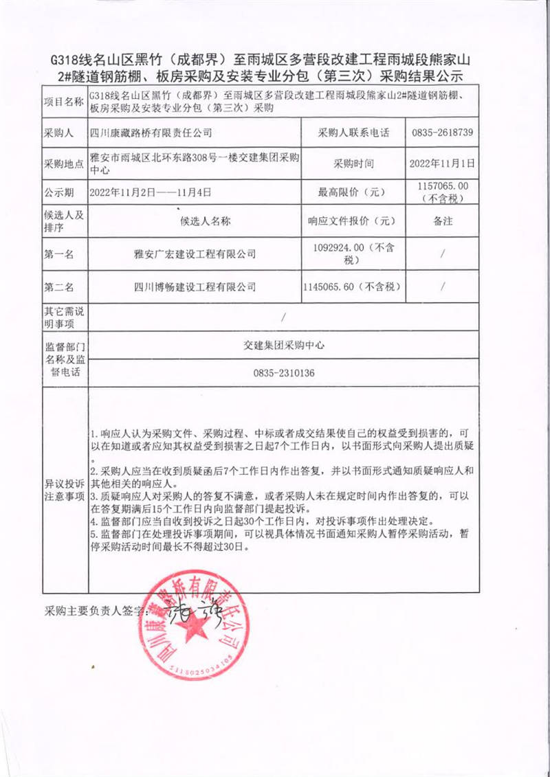 四川康藏路橋有限責(zé)任公司G318線名山區(qū)黑竹(成都界)至雨城區(qū)多營(yíng)段改建工程雨城段熊家山2#隧道鋼筋棚、板房采購(gòu)及安裝專業(yè)分包(第三次)采購(gòu)結(jié)果公示
