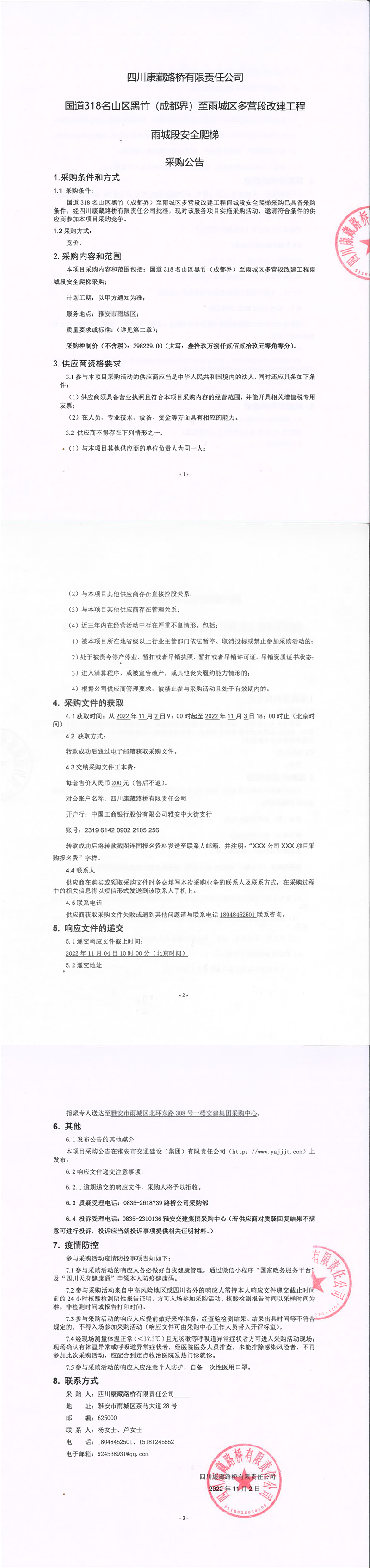 四川康藏路橋有限責(zé)任公司國(guó)道318名山區(qū)黑竹(成都界)至雨城區(qū)多營(yíng)段改建工程雨城段安全爬梯采購公告