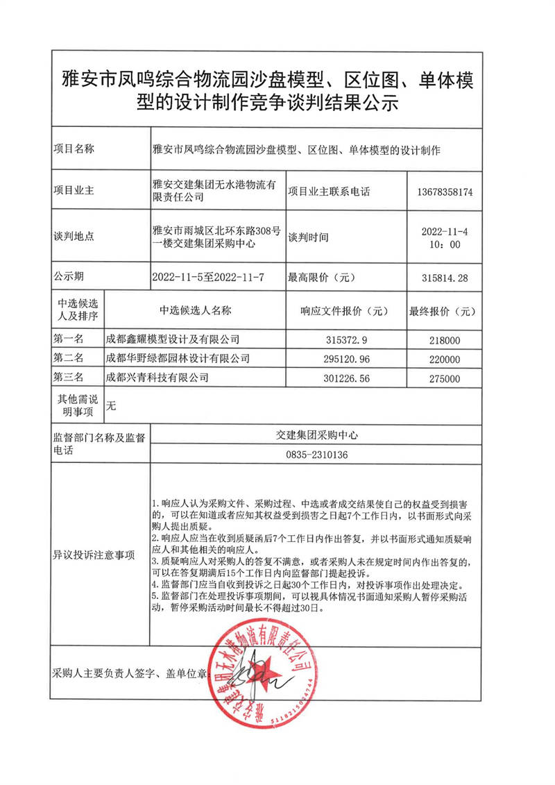 雅安交建集團無水港物流有限責任公司雅安市鳳鳴綜合物流園沙盤模型、區(qū)位圖、單體模型的設(shè)計制作競爭談判結(jié)果公示