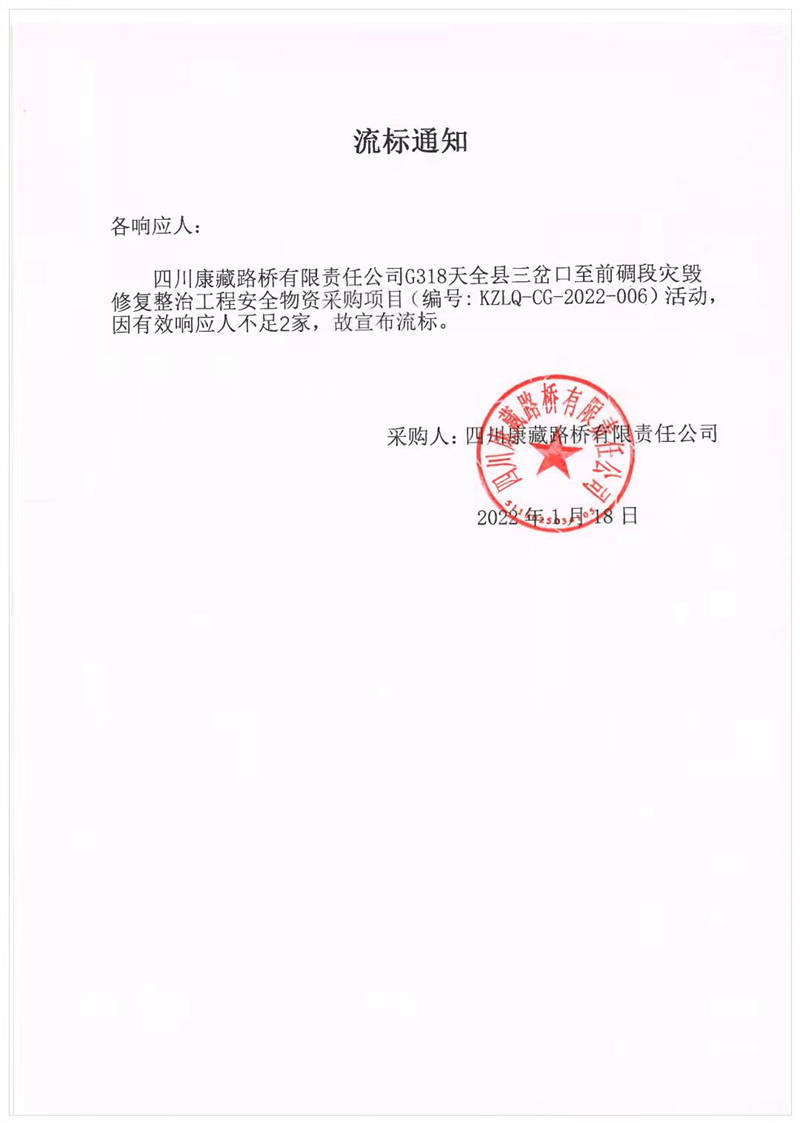 四川康藏路橋有限責(zé)任公司G318天全縣三岔口至前碉段災(zāi)毀修復(fù)整治工程安全物資采購項(xiàng)目流標(biāo)通知