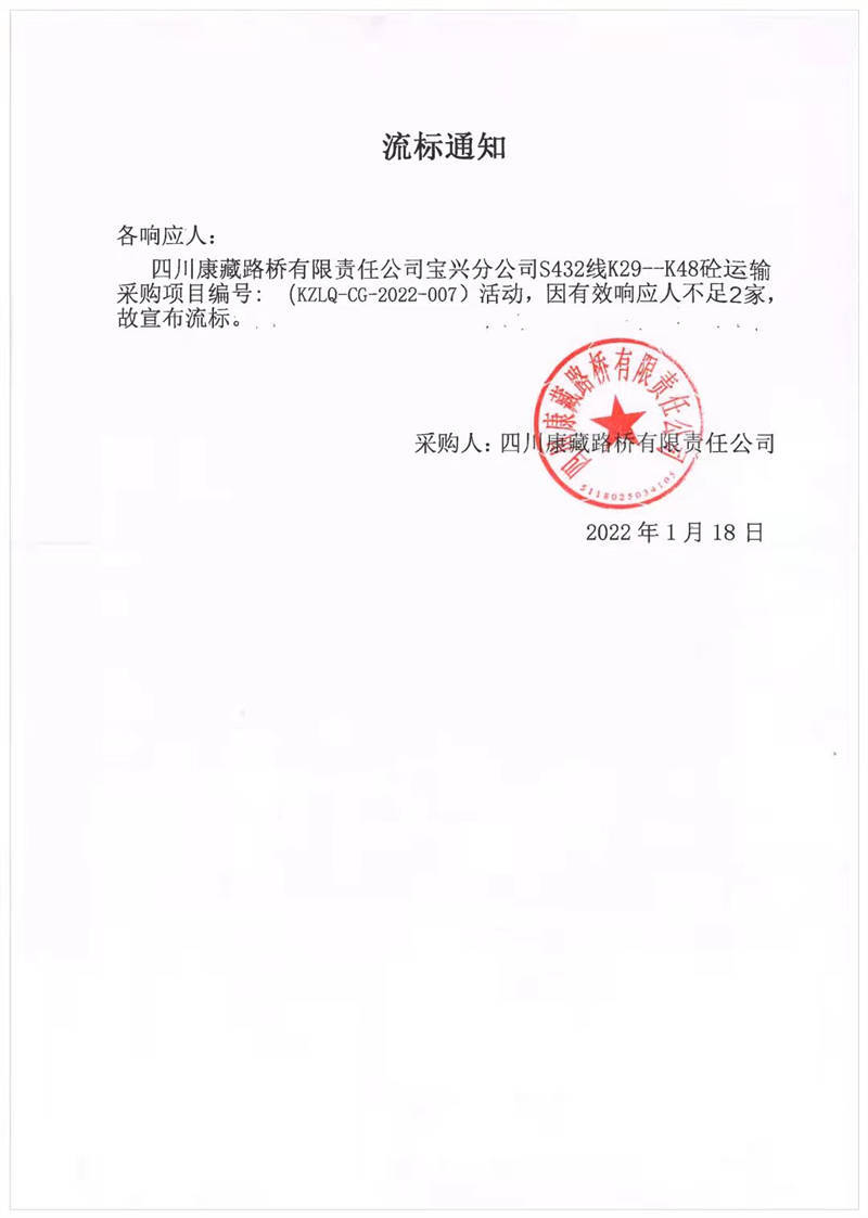 四川康藏路橋有限責任公司寶興分公司S432線K29-K48砼運輸采購項目流標通知