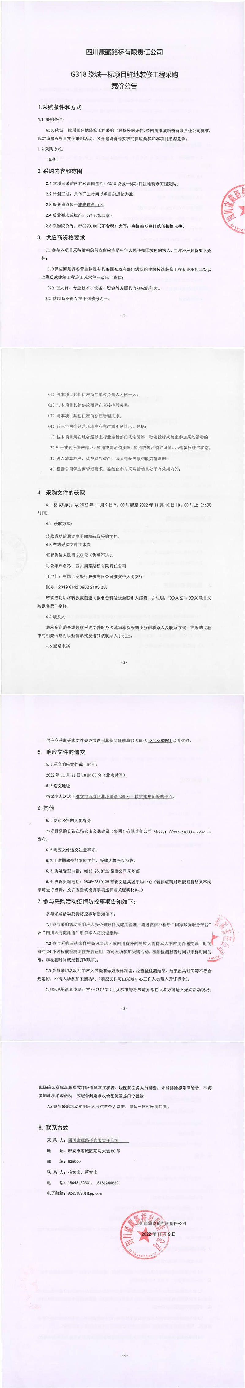 四川康藏路橋有限責(zé)任公司G318繞城一標項目駐地裝修工程采購競價公告