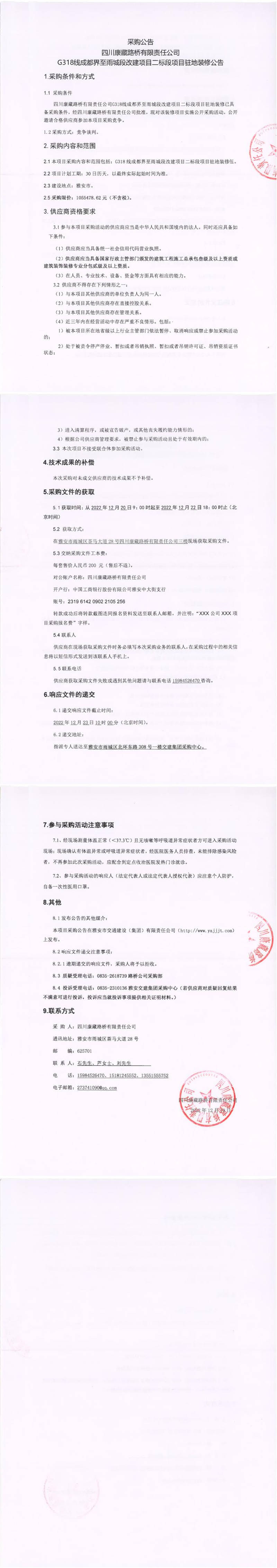 四川康藏路橋有限責(zé)任公司G318線成都界至雨城段改建項目二標段項目駐地裝修采購公告