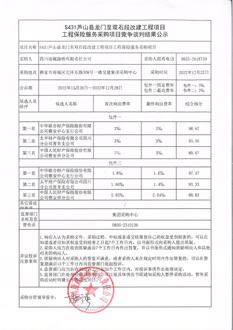 四川康藏路橋有限責(zé)任公司S431蘆山縣龍門至雙石段改建工程項(xiàng)目工程保險(xiǎn)服務(wù)采購項(xiàng)目競爭談判結(jié)果公示