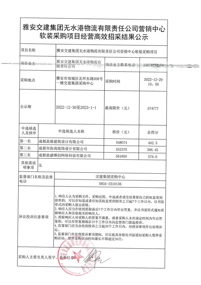 雅安交建集團無水港物流有限責任公司營銷中心軟裝采購項目經營高效招采結果公示