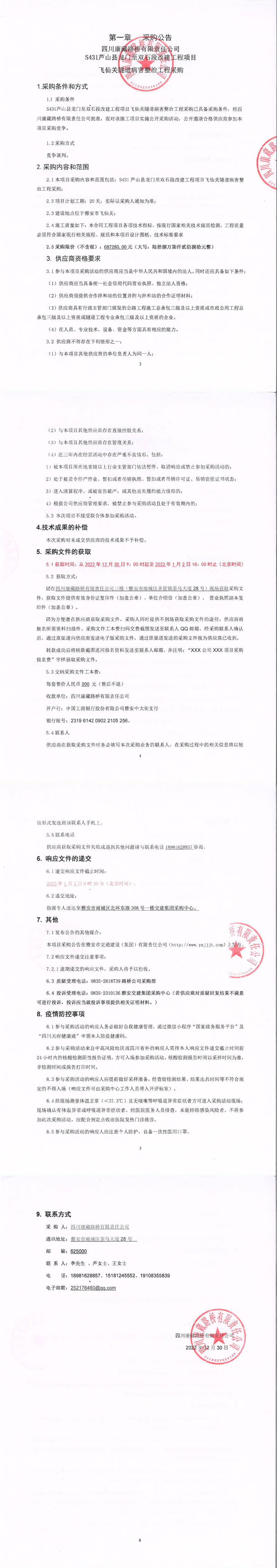 四川康藏路橋有限責任公司S431蘆山縣龍門至雙石段改建工程項目飛仙關隧道病害整治工程采購采購公告