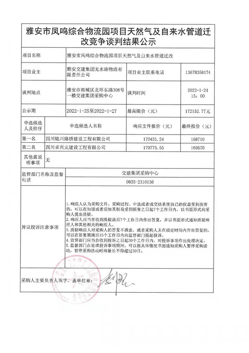 雅安交建集團(tuán)無水港物流有限責(zé)任公司雅發(fā)市鳳鳴綜合物流園項(xiàng)目天然氣及自來水管道遷改競(jìng)爭談判結(jié)果公示