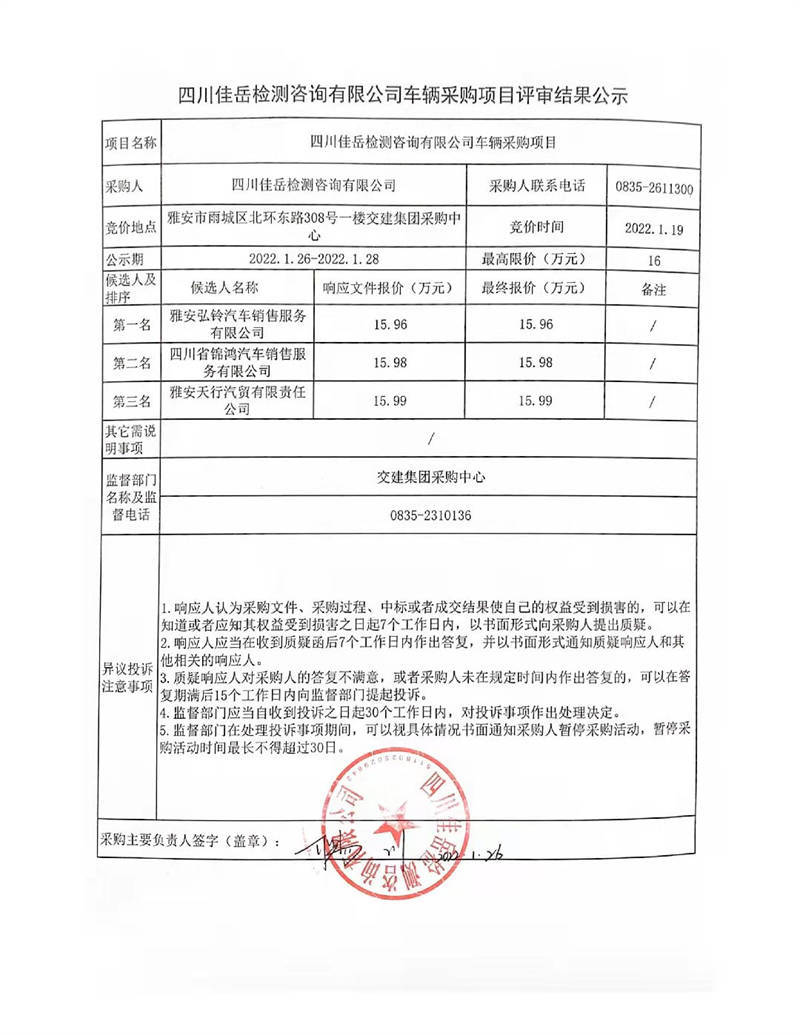 四川佳岳檢測咨詢有限公司車輛采購項目評審結果公示