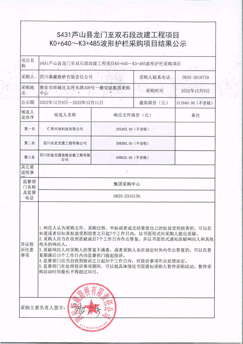 四川康藏路橋有限責(zé)任公司S431蘆山縣龍門至雙石段改建工程項(xiàng)目K0+640~K3+485波形護(hù)欄采購項(xiàng)目結(jié)果公示