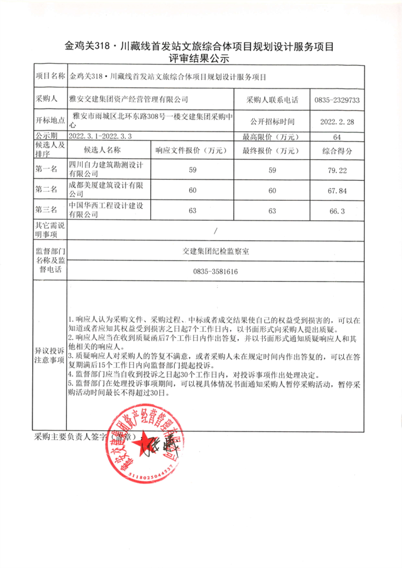 雅安交建集團資產經營管理有限公司金雞關318.川藏線首發(fā)站文旅綜合體項目規(guī)劃設計服務項目評審結果公示