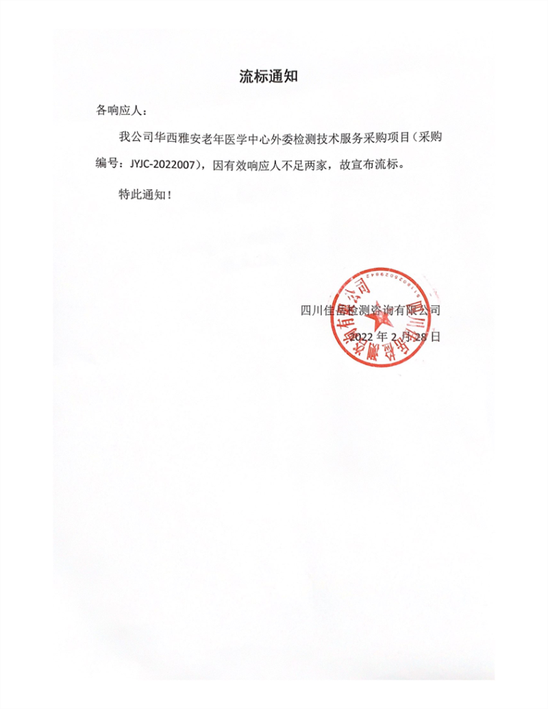四川佳岳檢測(cè)咨詢有限公司華西雅安老年醫(yī)學(xué)中心外委檢測(cè)技術(shù)服務(wù)采購(gòu)項(xiàng)目流標(biāo)通知