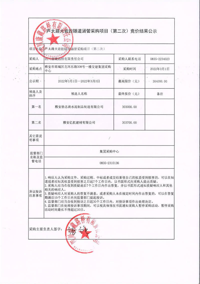 四川康藏路橋有限責任公司蘆太路大巖腔隧道涵管采購項目(第二次)競價結(jié)果公示