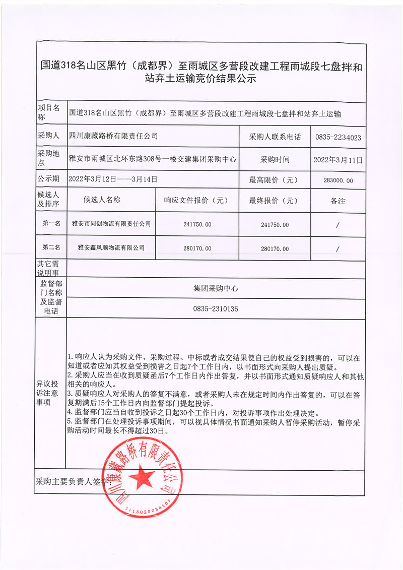 四川康藏路橋有限責(zé)任公司國(guó)道318名山區(qū)黑竹(成都界)至雨城區(qū)多營(yíng)段改建工程雨城段七盤拌和站棄土運(yùn)輸競(jìng)價(jià)結(jié)果公示