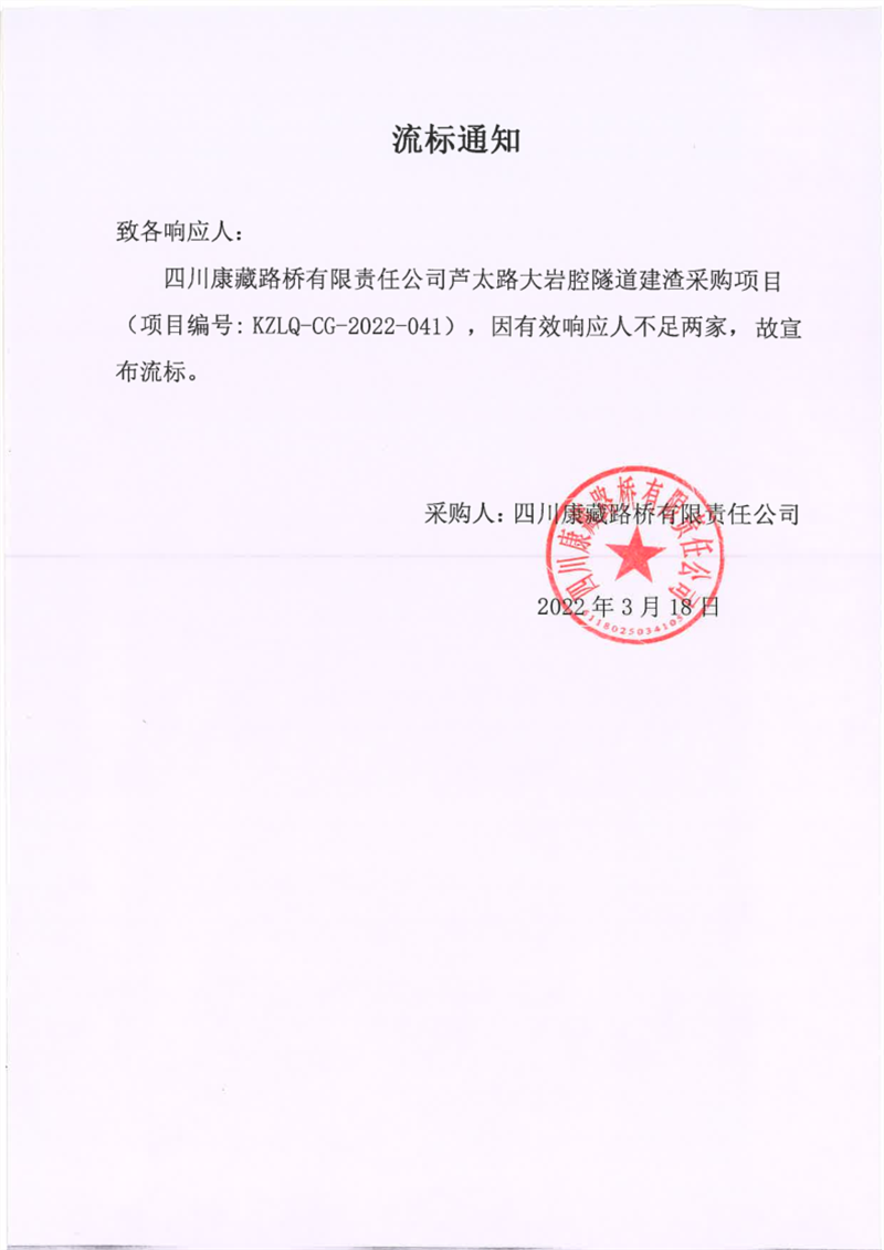 四川康藏路橋有限責(zé)任公司蘆太路大巖腔隧道建渣采購項目流標(biāo)通知
