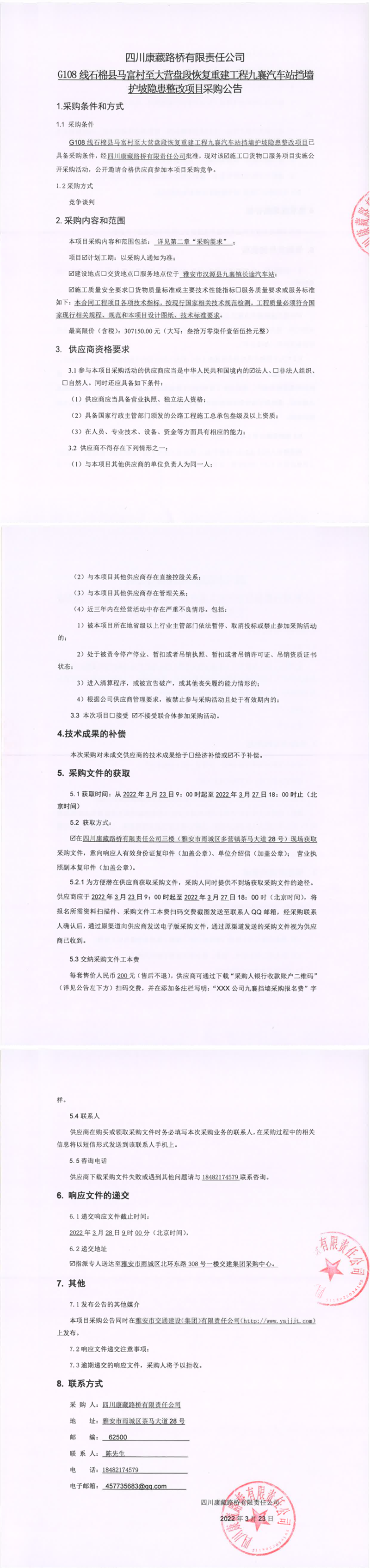 四川康藏路橋有限責(zé)任公司G108線石棉縣馬福村至大營(yíng)盤段恢復(fù)重建工程九襄汽車站擋墻護(hù)坡隱患整改項(xiàng)目采購公告