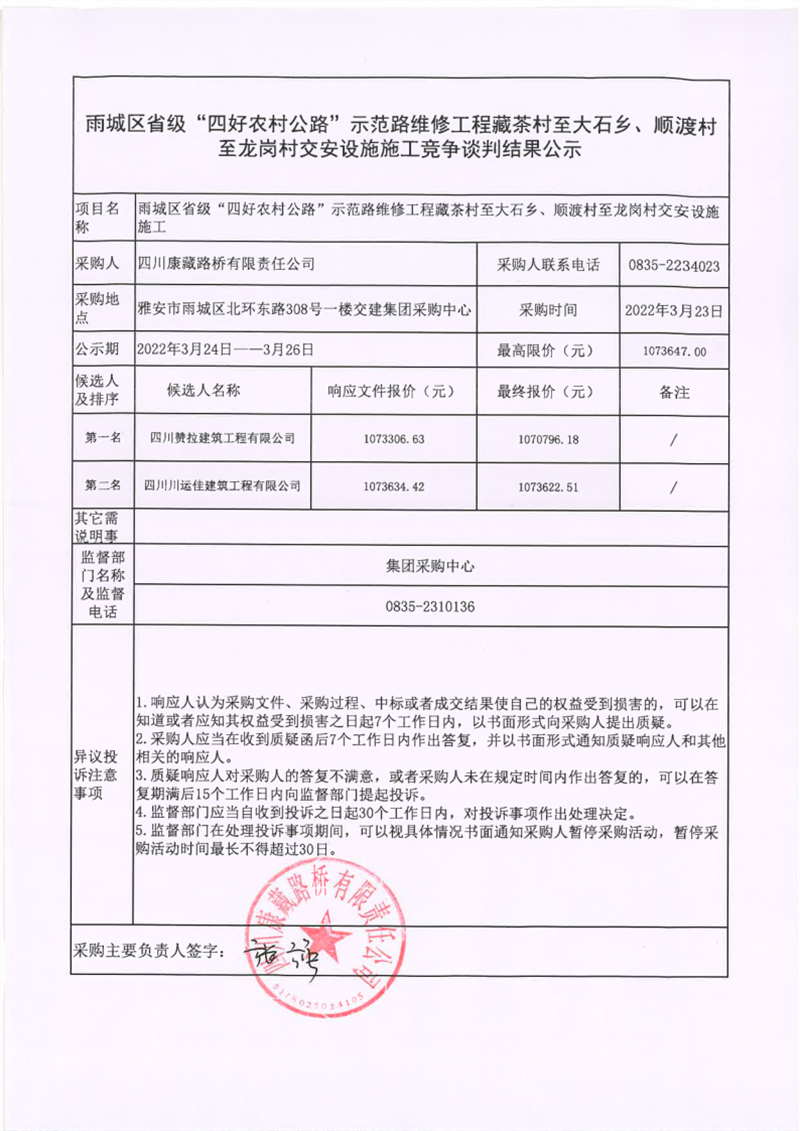 四川康藏路橋有限責任公司雨城區(qū)省級“四好農(nóng)村公路”示范路維修工程藏茶村至大石鄉(xiāng)、順渡村至龍崗村交安設(shè)施施工競爭談判結(jié)果公示