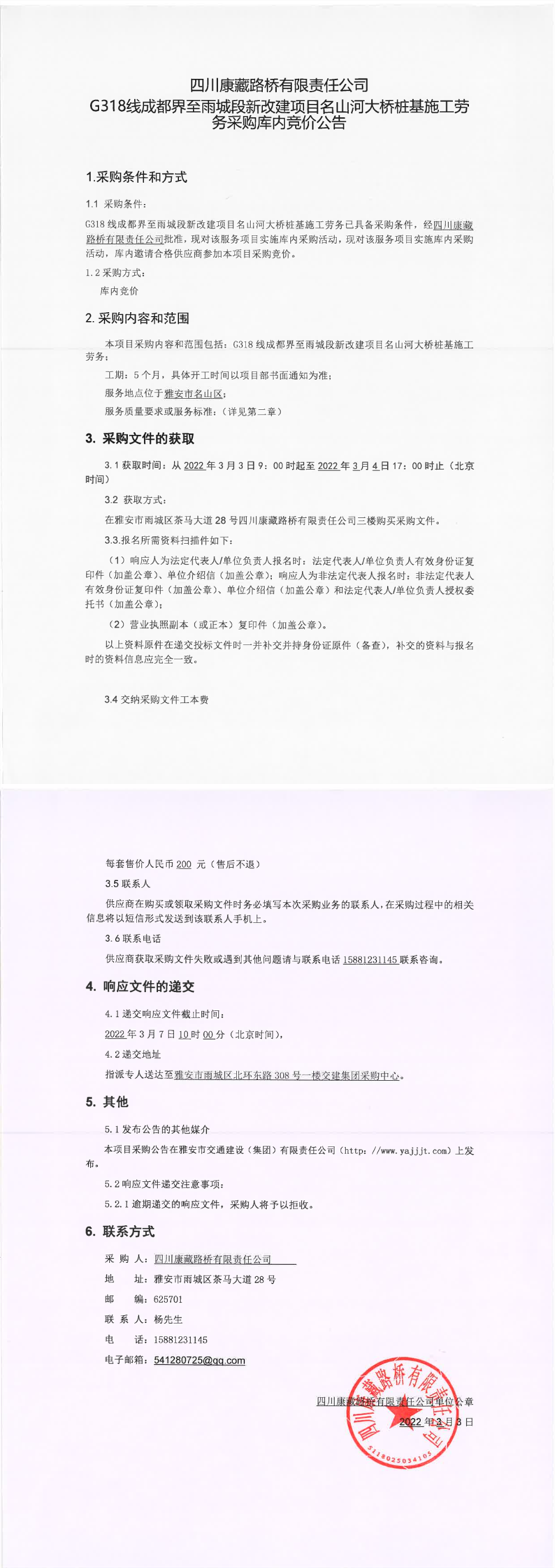 四川康藏路橋有限責任公司G318線成都界至雨城段新改建項目名山河大橋樁基施工勞務采購庫內競價公告