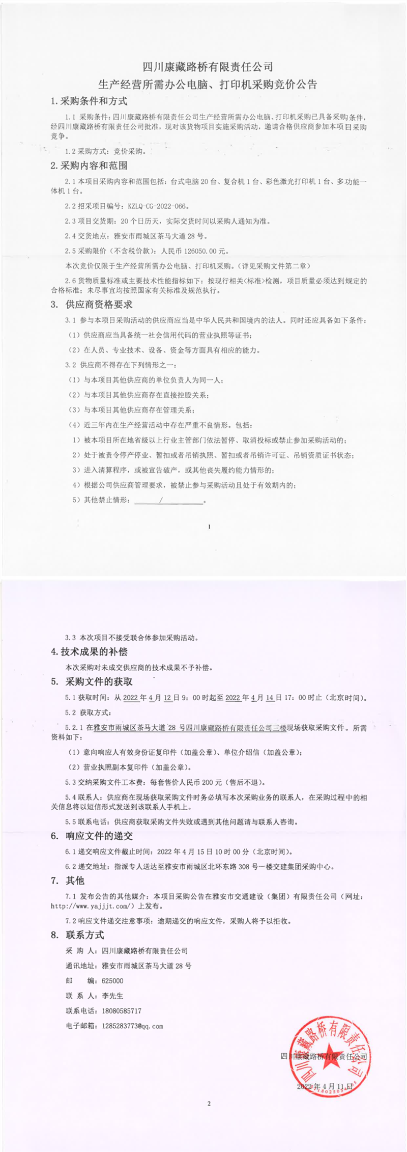 四川康藏路橋有限責(zé)任公司生產(chǎn)經(jīng)營所需辦公電腦、打印機采購競價公告