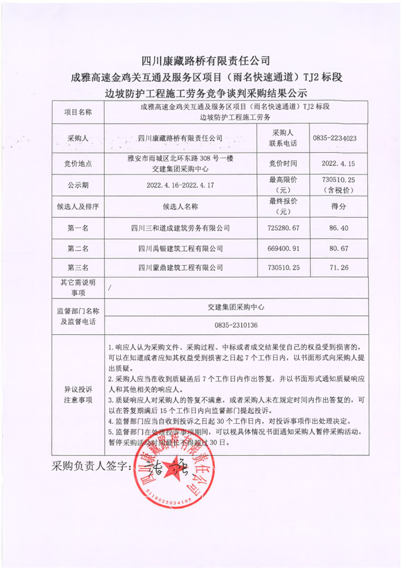四川康藏路橋有限責(zé)任公司成雅高速金雞關(guān)互通及服務(wù)區(qū)項目(雨名快速通道)TJ2標段邊坡防護工程施工勞務(wù)競爭談判采購結(jié)果公示