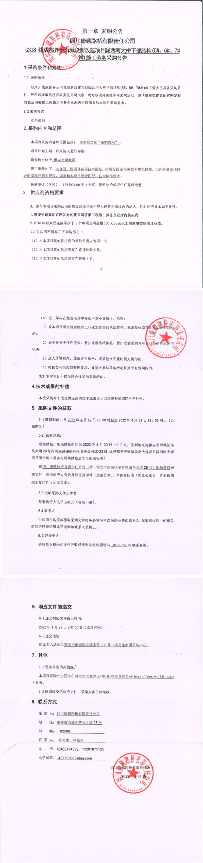 四川康藏路橋有限責(zé)任公司G318線成都界至雨城段新改建項(xiàng)目隴西河大橋下部結(jié)構(gòu)(5#、6#、7#墩)施工勞務(wù)采購(gòu)公告