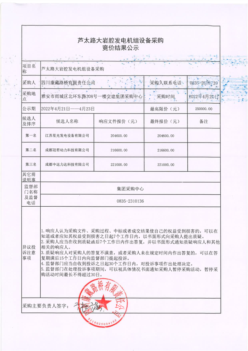 四川康藏路橋有限責(zé)任公司蘆太路大巖腔發(fā)電機(jī)組設(shè)備采購(gòu)競(jìng)價(jià)結(jié)果公示