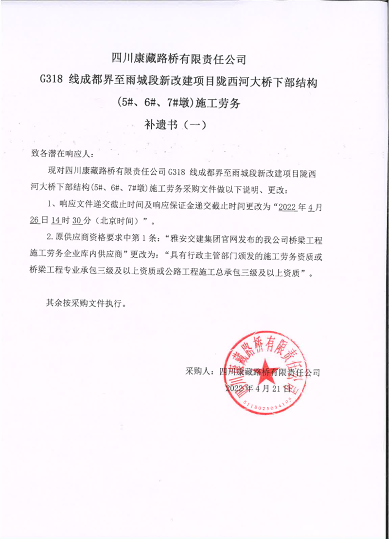 四川康藏路橋有限責(zé)任公司G318線(xiàn)成都界至雨城段新改建項(xiàng)目隴西河大橋下部結(jié)構(gòu)(5#、6#、7#墩)施工勞務(wù)補(bǔ)遺書(shū)(一)