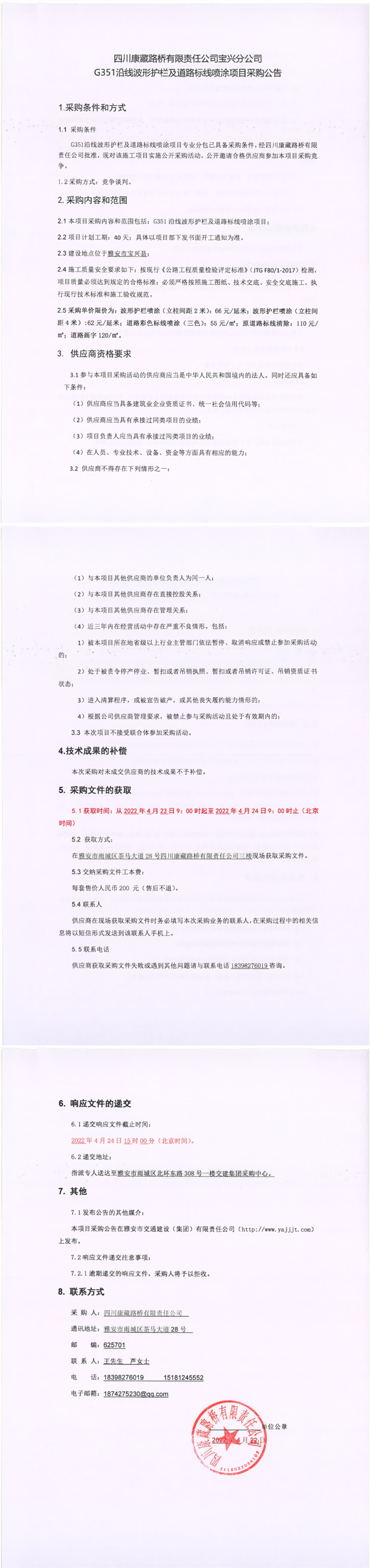 四川康藏路橋有限責(zé)任公司寶興分公司G351沿線波形護欄及道路標線噴涂項目采購公告