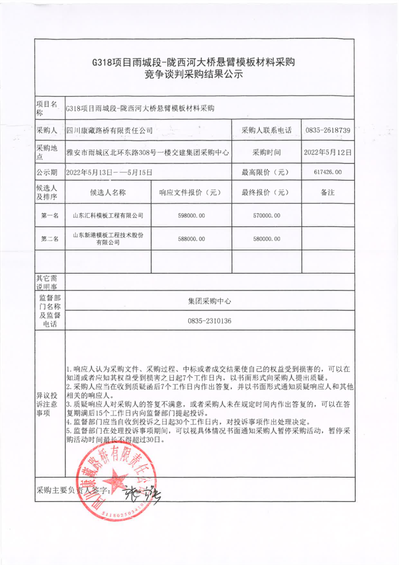 四川康藏路橋有限責任公司G318項目雨城段-隴西河大橋懸臂模板材料采購競爭談判采購結(jié)果公示