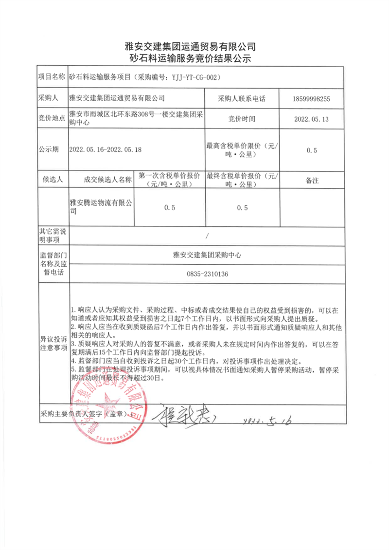 雅安交建集團運通貿(mào)易有限公司砂石料運輸服務(wù)競價結(jié)果公示