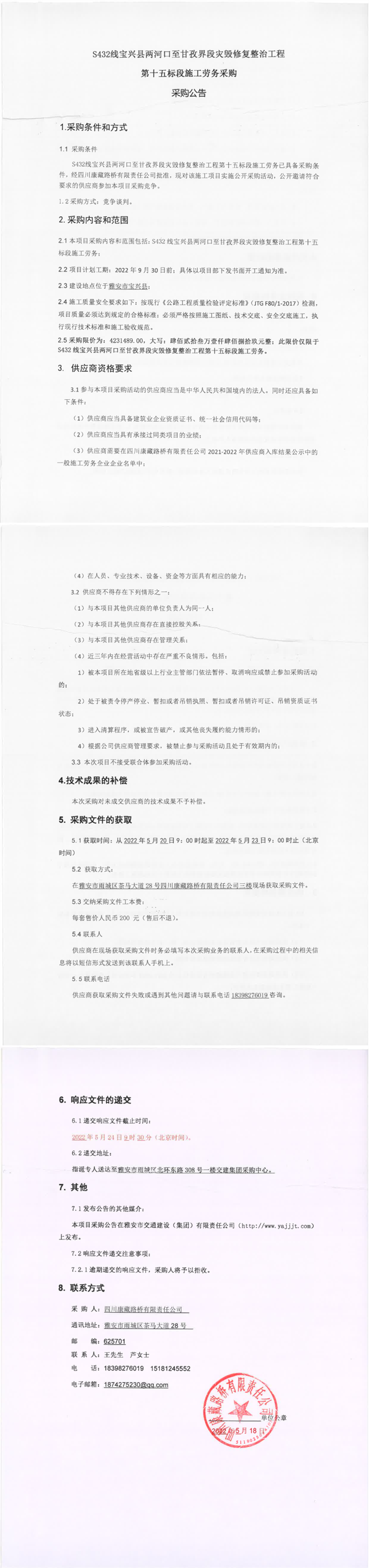 四川康藏路橋有限責任公司S432線寶興縣兩河口至甘孜界段災毀修復整治工程第十五標段施工勞務采購采購公告