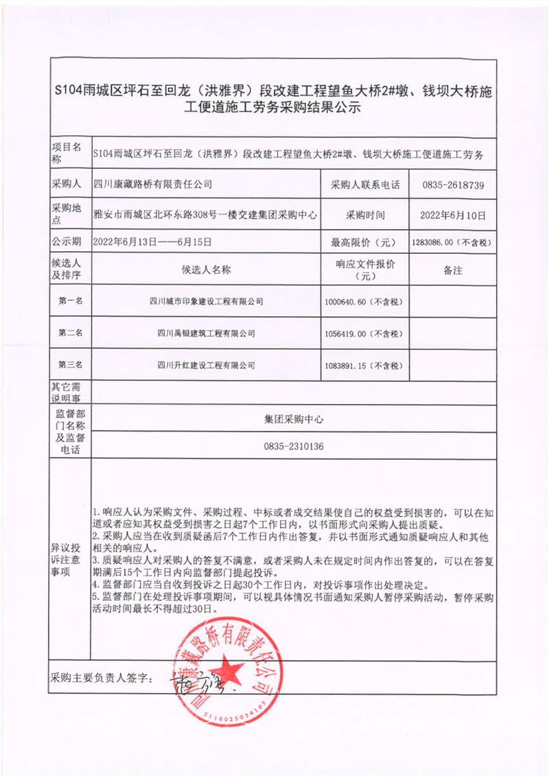 四川康藏路橋有限責任公司S104雨城區(qū)坪石至回龍(洪雅界)段改建工程望魚大橋2#墩、錢壩大橋施工便道施工勞務(wù)采購結(jié)果公示