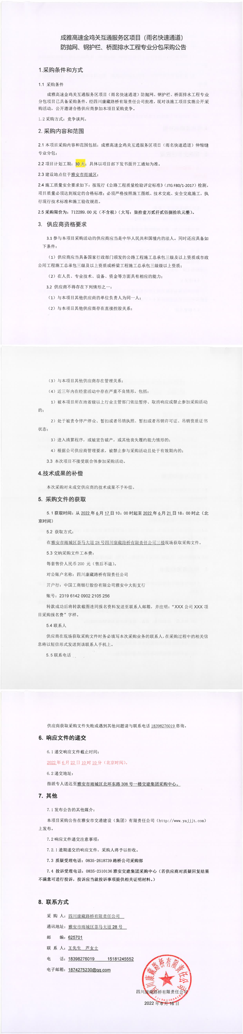 四川康藏路橋有限責(zé)任公司成雅高速金雞關(guān)互通服務(wù)區(qū)項目(雨名快速通道)防拋網(wǎng)、鋼護欄、橋面排水工程專業(yè)分包采購公告