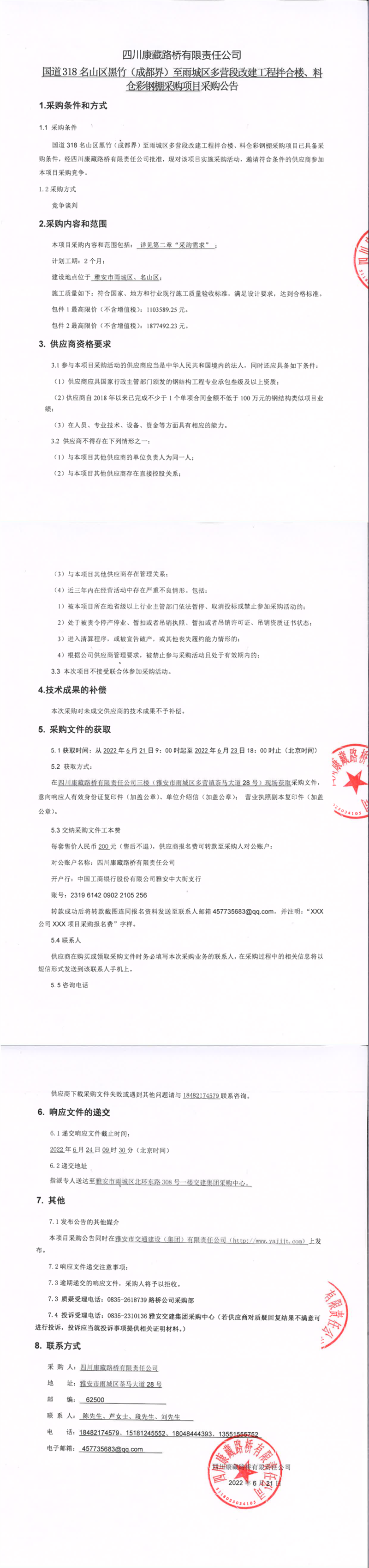 四川康藏路橋有限責(zé)任公司國道318名山區(qū)黑竹(成都界)至雨城區(qū)多營段改建工程拌合樓、料倉彩鋼棚采購項目采購公告