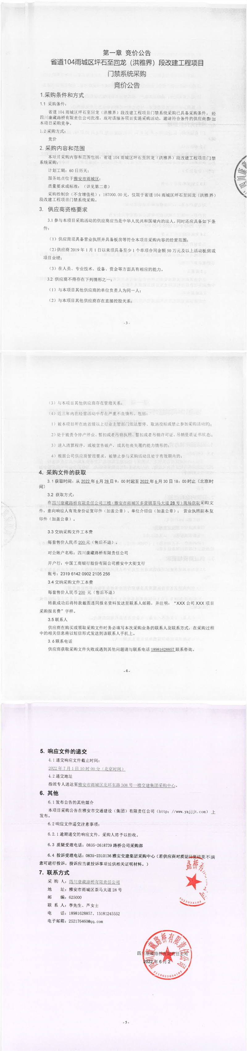 四川康藏路橋有限責(zé)任公司省道104雨城區(qū)坪石至回龍(洪雅界)段改建工程項目門禁系統(tǒng)采購