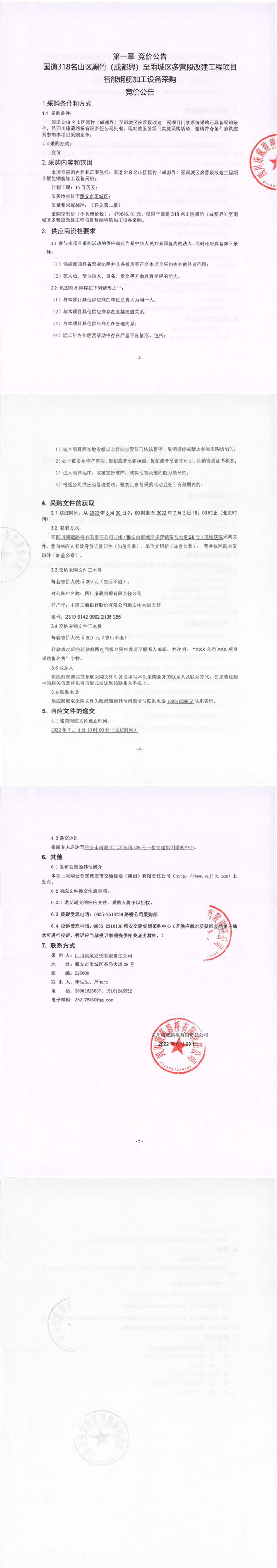 四川康藏路橋有限責(zé)任公司國道318名山區(qū)黑竹(成都界)至雨城區(qū)多營段改建工程項(xiàng)目智能鋼筋加工設(shè)備采購競價(jià)公告