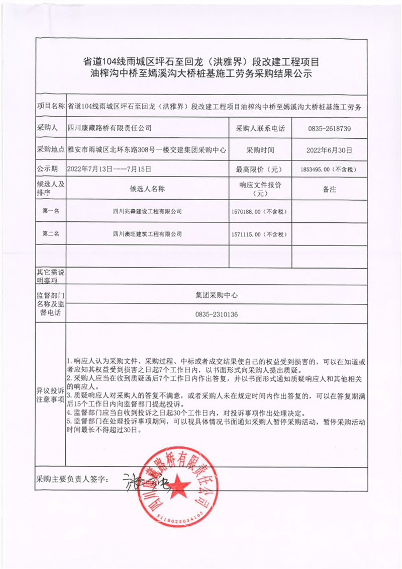 四川康藏路橋有限責任公司省道104線雨城區(qū)坪石至回龍(洪雅界)段改建工程項目油榨溝中橋至嫣溪溝大橋樁基施工勞務(wù)采購結(jié)果公示