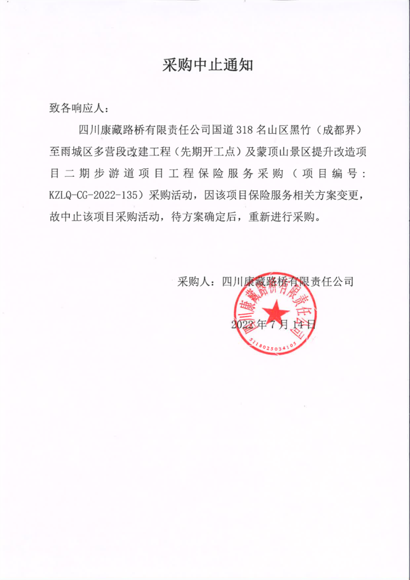 四川康藏路橋有限責任公司國道318名山區(qū)黑竹(成都界)至雨城區(qū)多營段改建工程(先期開工點)及蒙頂山景區(qū)提升改造項目二期步游道項目工程保險服務(wù)采購中止通知