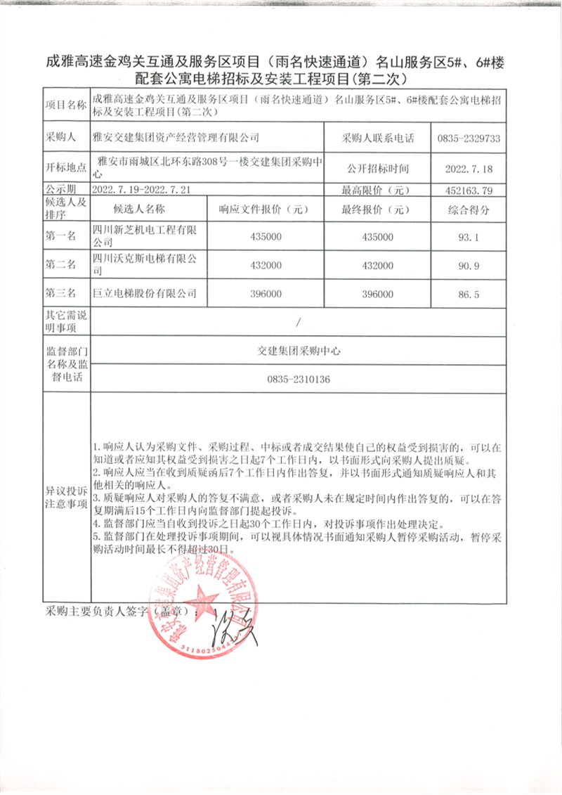 雅安交建集團資產(chǎn)經(jīng)營管理有限公司成雅高速金雞關互通及服務區(qū)項目(雨名快速通道)名山服務區(qū)5#、6#樓配套公寓電梯招標及安裝工程項目招標公告(第二次)結果公示