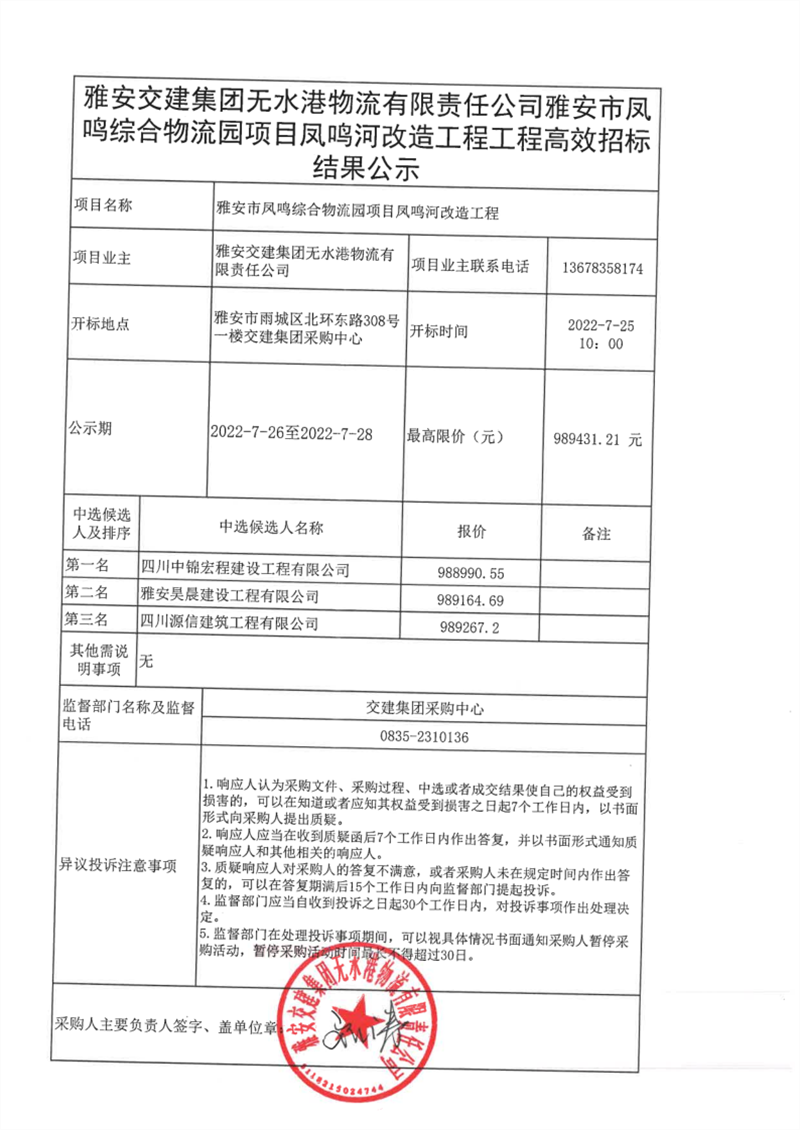 雅安交建集團無水港物流有限責(zé)任公司雅安市鳳鳴綜合物流園鳳鳴河改造工程工程高效招標結(jié)果公示